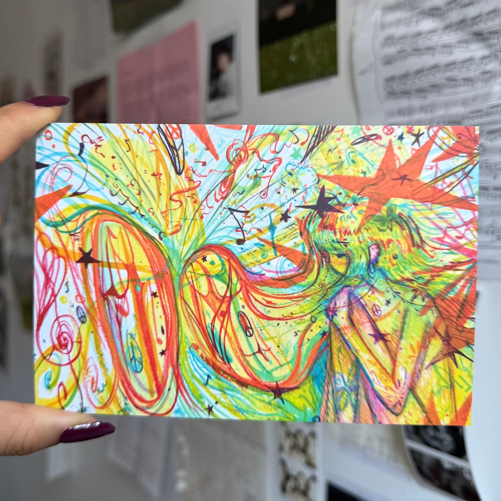 10.2 x 15.2 cm postcard with a matte finish. hang it on your wall, write a letter to send to a loved one, or write a love letter to yourself to take with you everywhere.